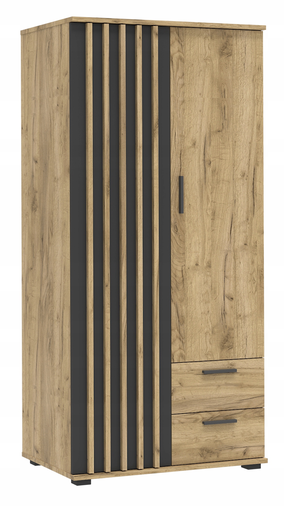 Szukasz praktycznego miejsca na ubrania i dodatki? Nasza szafa łączy elegancki wygląd z przemyślaną funkcjonalnością. Dzięki połączeniu kolorów dąb craft i czerni oraz nowoczesnym drzwiom z lamelami, stanie się ozdobą sypialni, przedpokoju lub garderoby.